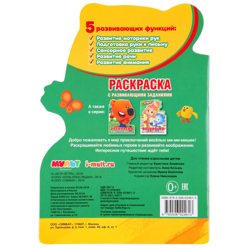 Развивающая раскраска "МиМиМишки" - новое предложение от ТМ «УМка», специально для поклонников знаменитого мультика. Книга изготовлена из высококачественной белой бумаги с обложкой из плотного картона и вырубкой в виде силуэта Кеши. Она содержит раскраски и развивающие задания, дополнена вкладышем с 16 цветными наклейками. Дети раскрашивают своих любимых мультипликационных героев, выполняют увлекательные задания и наклеивают стикеры. Занятия по книге развивают внимание, память, фантазию, воображение, координацию движений, усидчивость и мелкую моторику рук. Готовят руку к письму, расширяют кругозор.